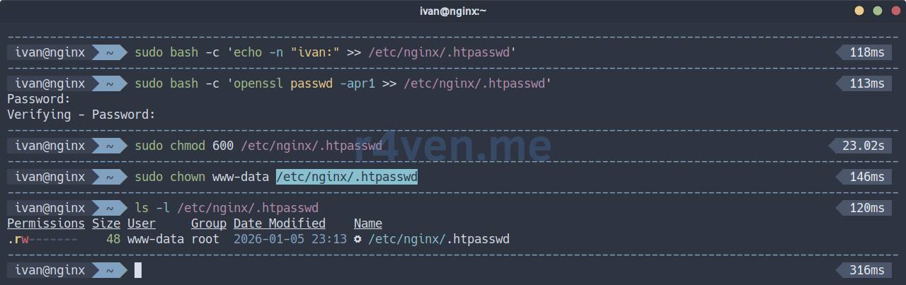 sudo bash -c 'echo -n "ivan:" >> /etc/nginx/.htpasswd'