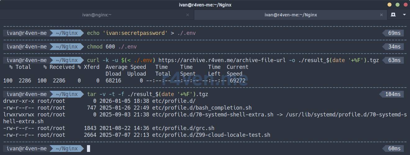 curl -k -u ivan:secretpassword https://archive.r4ven.me/archive-file-url -o result_$(date '+%F').tgz