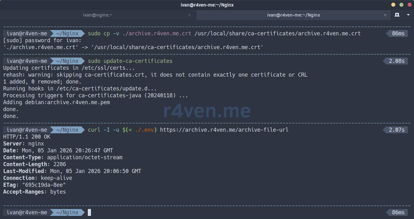 sudo cp -v ./archive.r4ven.me.crt /usr/local/share/ca-certificates/archive.r4ven.me.crt