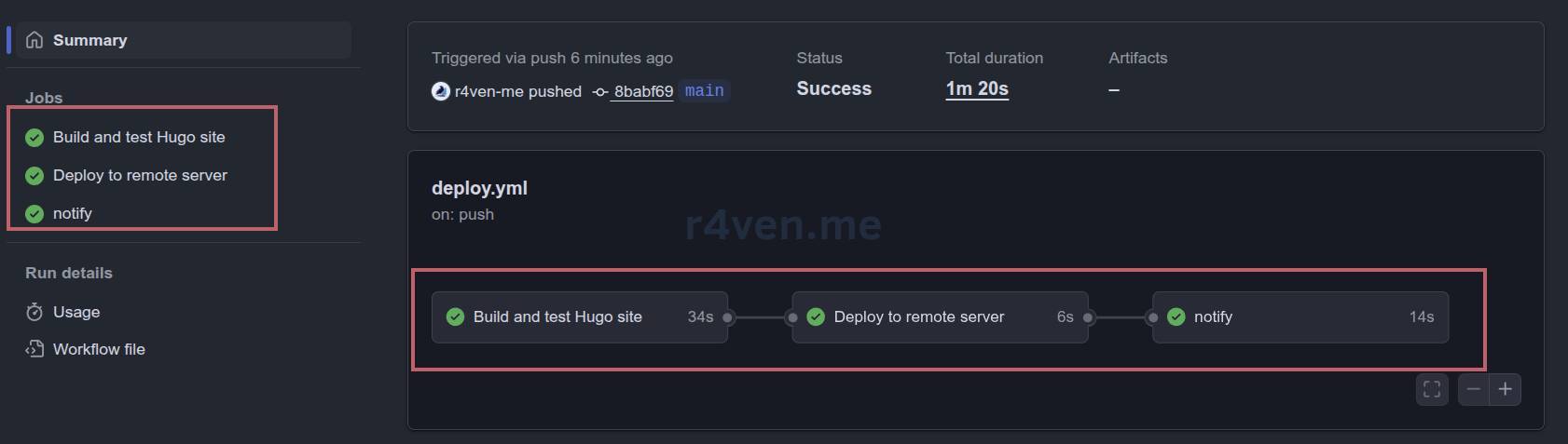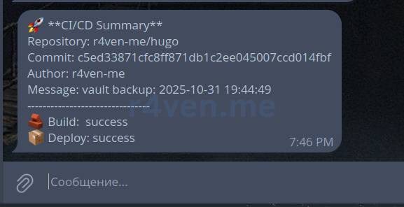 - Notify: проверка статуса и отправка уведомления в Telegram об успехе/провале деплоя.
