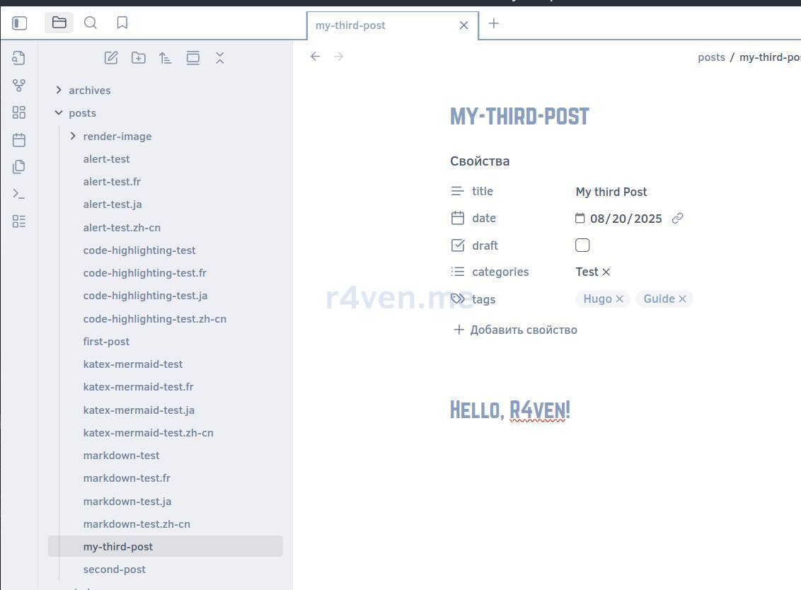 И Enter. В результате в папке posts создастся отдельная папка для заметки (дата + имя транслитом) и файл index.md, с уже заполненным front-matter и телом статьи.